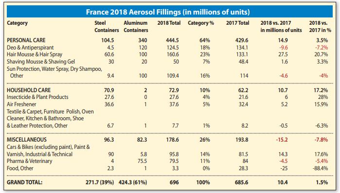 According to Comit é Fran ç AIS des a é rosols (French aerosol commission or CFA), the total number of aerosol products in France in 2018 was 696 million. This is an increase of 10.4 million (1.5%) over 685.6 million in 2017.